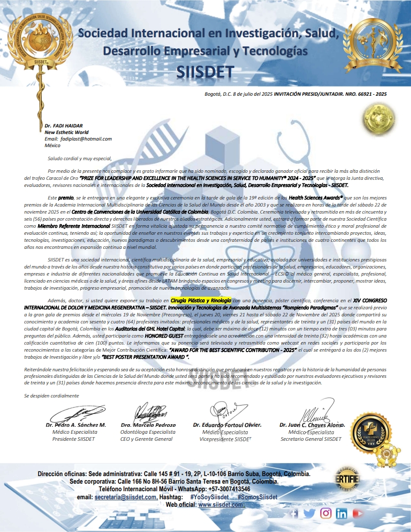 La Sociedad Internacional en Investigación, Salud, Desarrollo Empresarial y Tecnologías (SIISDET) notifica al Dr. Fadi Haidar que ha sido nominado y declarado ganador del premio Caracol de Oro “Prize for Leadership and Excellence in the Health Sciences in Service to Humanity 2024–2025”.